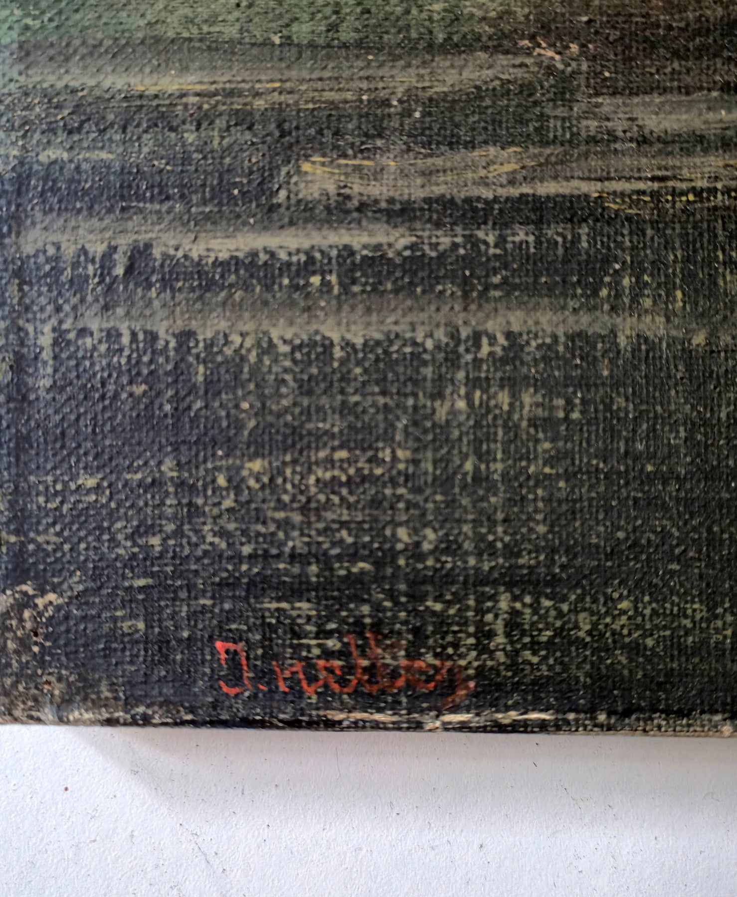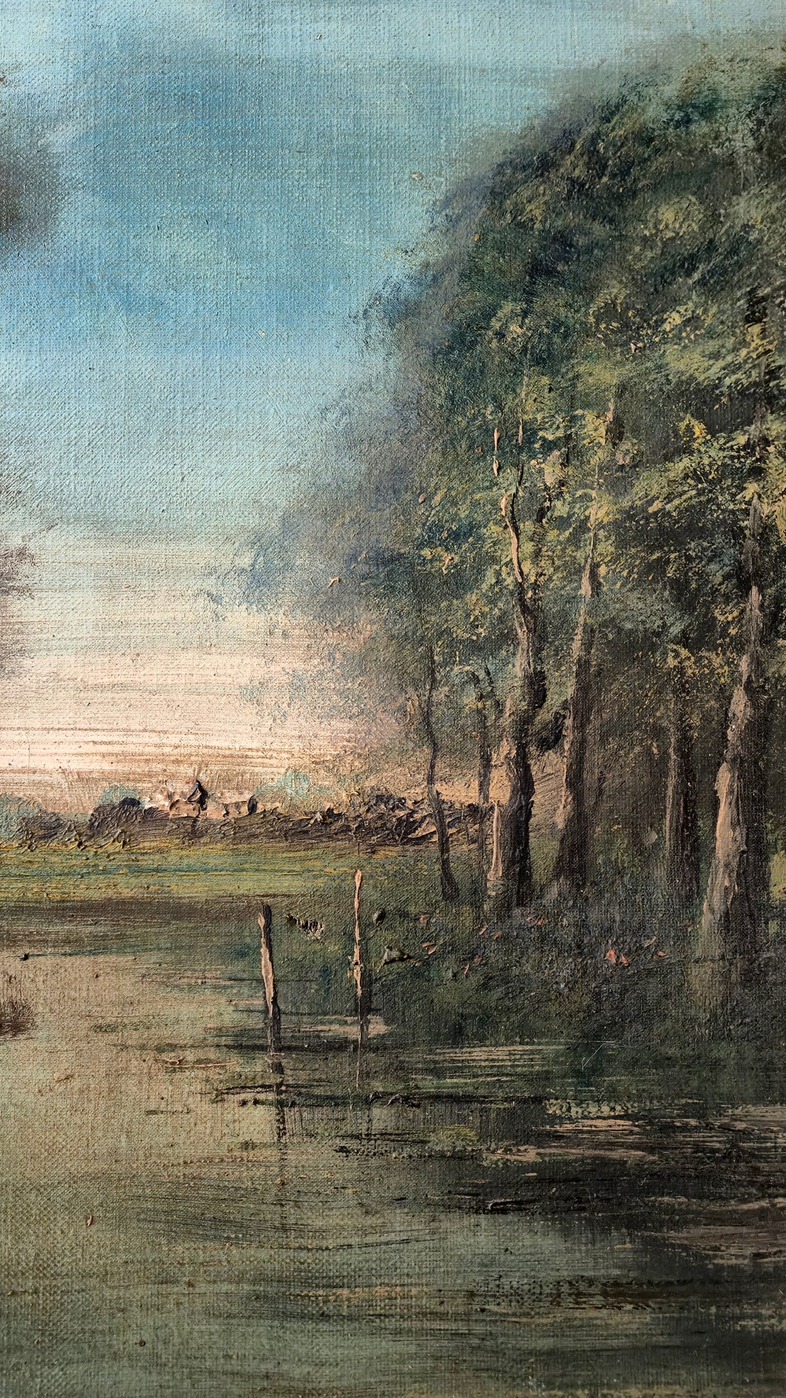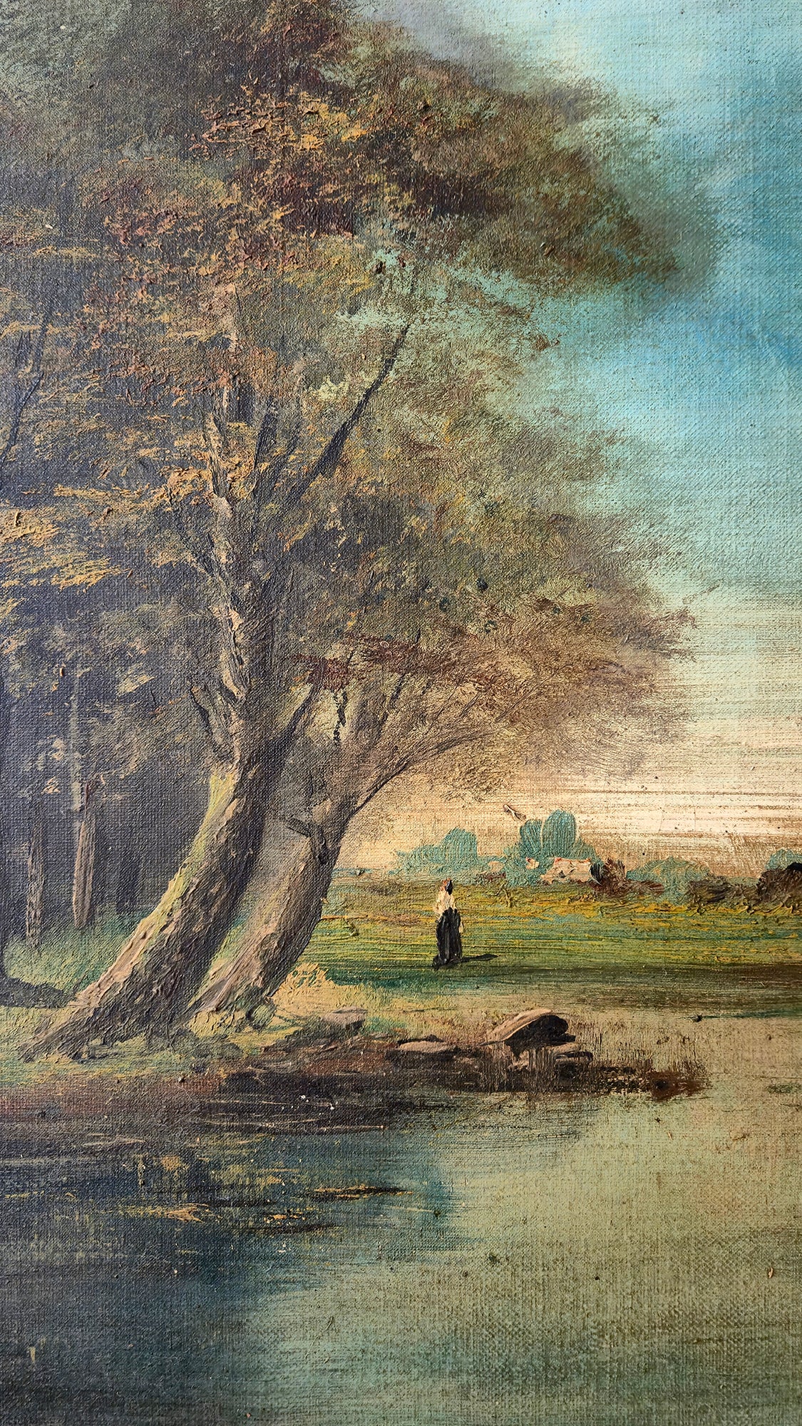 Suggestivo paesaggio ottocentesco su tela, acquistato in Francia, raffigurante una scena campestre con figure, alberi autunnali e riflessi sull’acqua. Firmato in basso a sinistra (possibile lettura: J. Nettry), montato su telaio originale con crociera interna. L’opera richiama la poetica della scuola di Barbizon, con luce diffusa e atmosfera serena. Ideale per collezionisti o ambienti eleganti.