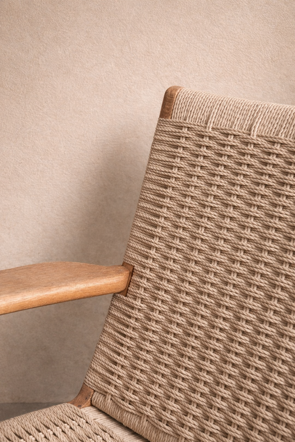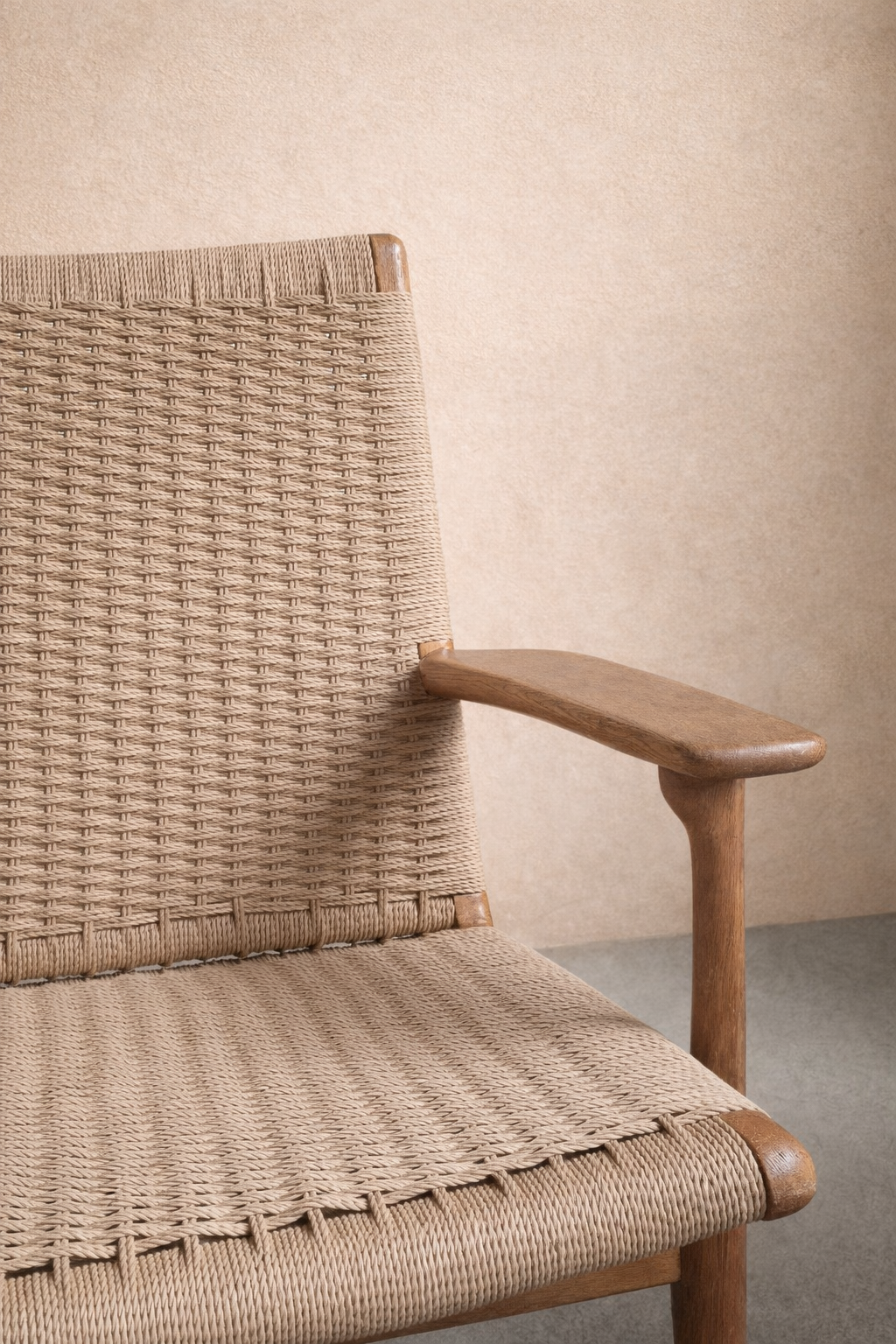Struttura in quercia massello, seduta e schienale intrecciati in corda di carta naturale (paper cord) con caratteristico intreccio a doppio motivo.